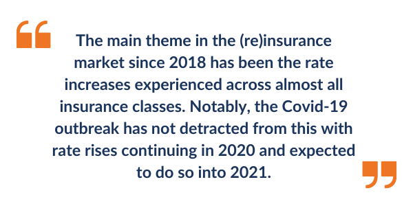 The main theme in the (re)insurance market since 2018 has been the rate increases experienced across almost all insurance classes. Notably, the Covid-19 outbreak has not detracted from this with rate rises continuing in 2020 and expected to do so into 2021. The ultimate impact on claims experience from Covid-19 has been a constant source of discussion with business interruption coverage at the forefront